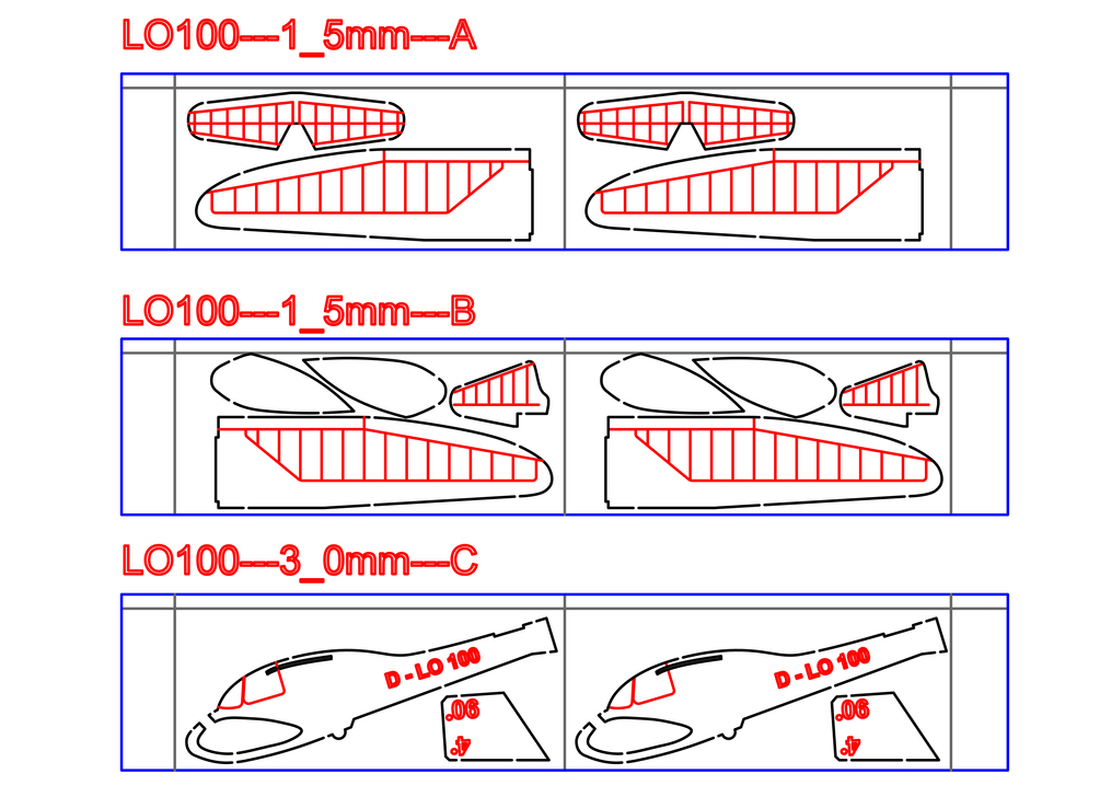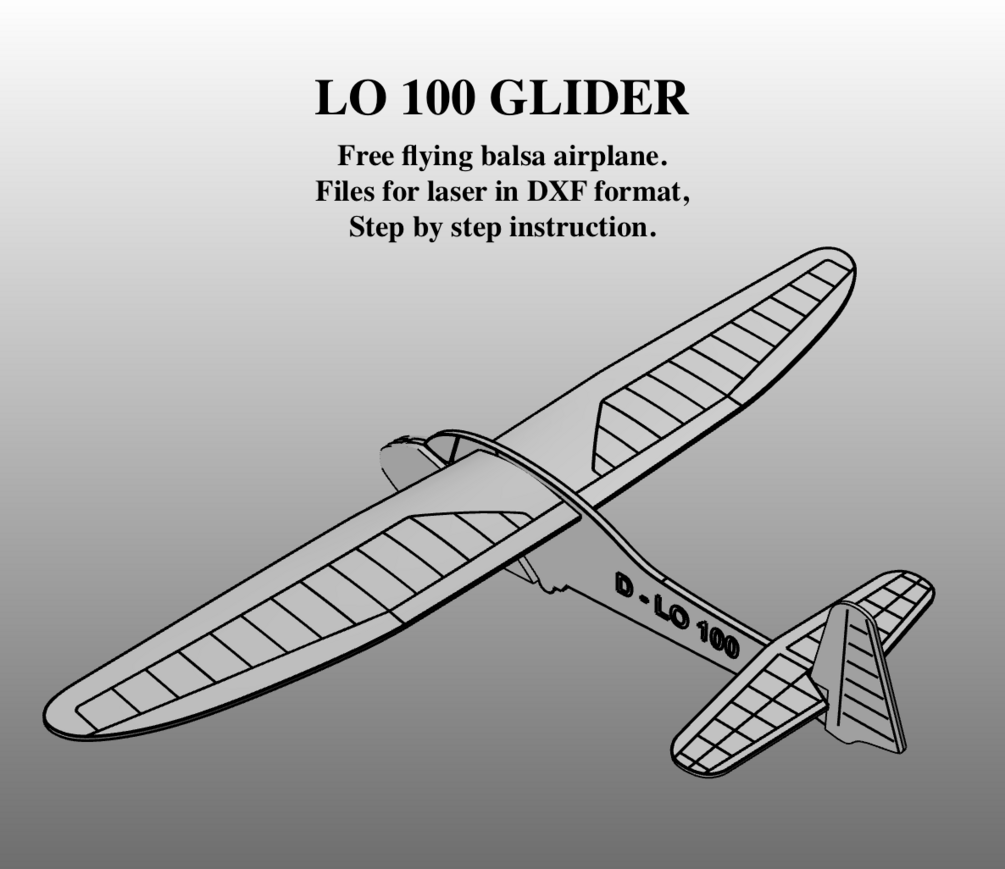 DXF data for laser of the LO-100 free flying balsa airplane for beginners with step by step instructions manual. It is prohibited to further distribute purchased data, whether for free or for a fee.
